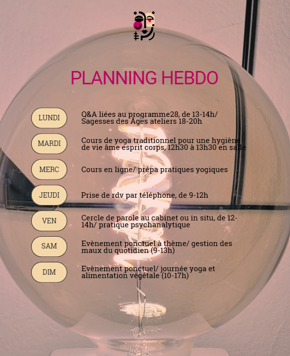 Je propose une pratique du yoga traditionnel, médecine douce et socle commun des différents courants de yoga: une hygiène de vie reliant les différentes dimensions de l’être et soutenant la santé globale au quotidien. Par la régularité de la pratique, elle participe à une évolution continue et à un processus de transformation, le changement étant la seule constante du monde vivant. → en savoir plus